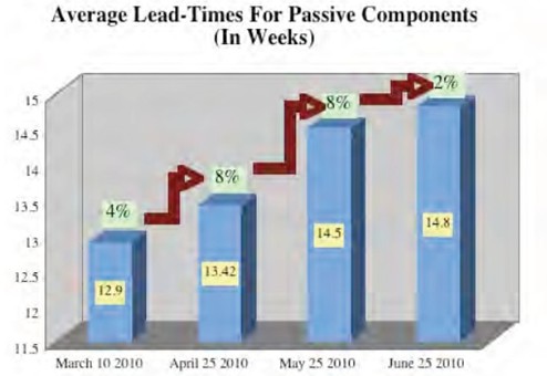 根據(jù)Paumanok Publications, Inc公司調(diào)查顯示,上月被動(dòng)元件交貨期平均每45天就延長(zhǎng)4%(被動(dòng)元件交貨期繼續(xù)延長(zhǎng) 供應(yīng)鏈持續(xù)緊張),最近一次調(diào)查則顯示,截止6月25日被動(dòng)元件交貨期和上月相比再次提升2%,平均交貨期為14.8周。下圖為3月至6月25日的被動(dòng)元件交貨期情況。