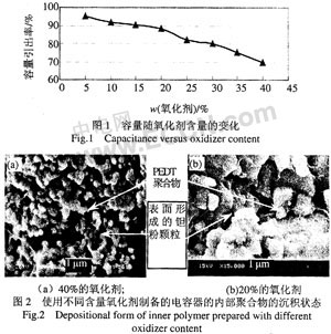 筆者重點討論了在用二步法制備聚合物電解質(zhì)的過程中氧化劑含量、聚合溫度等工藝條件對聚合物鉭電容器電容量C、介質(zhì)損耗和Res等電參數(shù)的影響。