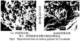 對于二步法生產(chǎn)工藝,單體為聚合反應(yīng)過程中的過量一方,聚合物生成的量由氧化劑的量來決定,聚合物在鉭芯表面的沉積數(shù)量隨氧化劑含量的增加而增加。從圖3可以看出,在相同的浸漬次數(shù)下,使用含量為5%的氧化劑陽極塊的質(zhì)量增加為0.54%,而使用含量為40%的氧化劑陽極塊質(zhì)量增加為3.52%,因此高含量的氧化劑可以有效增加聚合物的沉積量。