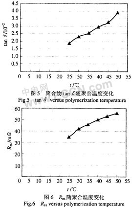 (2)聚合溫度對電容器的tanδ和Res有較大影響。電容器的tanδ和Res隨反應(yīng)溫度增加而增大,最佳聚合反應(yīng)溫度為25℃。