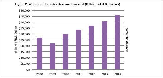到2014年,總體純晶圓代工產(chǎn)業(yè)的營業(yè)收入將從2008年的268億美元上升到459億美元,復(fù)合年度增長率為9.4%。