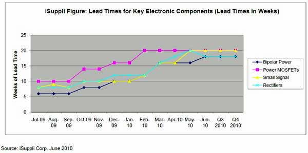 iSuppli指出,整體市場(chǎng)的交貨期比一個(gè)月以前所預(yù)期的拉長(zhǎng)很多;例如功率 MOSFET 與小型訊號(hào)晶體管的交貨期在6月時(shí)約20周,雙極功率組件(bipolar Power devices)與整流器的交貨期則為18周;而在正常情況下,這些零組件的交貨期應(yīng)該是10~12周。