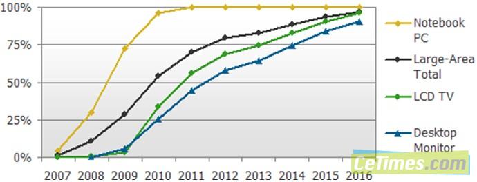 LED背光源已經(jīng)成為TFT LCD產(chǎn)業(yè)一個重要的關(guān)鍵零組件,并且在未來幾年將持續(xù)成長。根據(jù)DisplaySearch最新一季「LED背光源研究分析報告」中指出,估計在2012年第四季大尺寸液晶面板采LED背光源面板出貨量將超過冷陰極燈管(CCFL)背光源面板出貨量,且滲透率將高達(dá)80%。