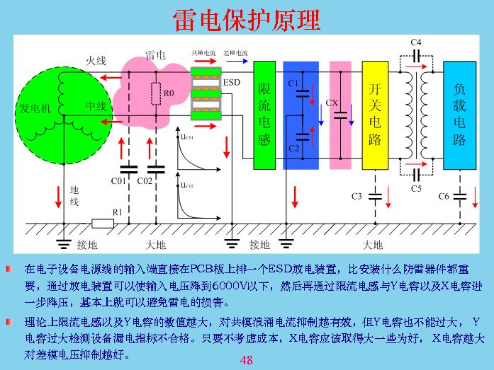 大家想想看,跟前面我們所說(shuō)的,感應(yīng)雷這個(gè)東西沒(méi)有一個(gè)標(biāo)準(zhǔn)的概念說(shuō)什么叫做感應(yīng)雷。只要打雷的話,外面打雷,窗戶上面的金屬,如果夜間都可以看到放電產(chǎn)生火花,這就是通過(guò)電磁感應(yīng)產(chǎn)生的位移電流原理。從原理上來(lái)說(shuō),三相四線或三相五線,發(fā)電機(jī)有中線接地,設(shè)備使用者的外殼接地是最有效的避雷方法,但現(xiàn)在很多設(shè)備都不接地,沒(méi)有辦法接,只有很貴重的進(jìn)口設(shè)備用三相電源,中間那一條地線,地線不是中線,大家要搞清楚。中線雖然是接地的,但在這里不能當(dāng)成地線,地線一定是自己大樓本身的地,而且要量好接地的地線。因?yàn)榈鼐€接進(jìn)去以后,大樓對(duì)外面的電磁層進(jìn)行屏蔽了,大樓相對(duì)來(lái)說(shuō)也是導(dǎo)電的,就算不導(dǎo)電,現(xiàn)在國(guó)家都有安全要求,大樓超過(guò)多少層都要加上避雷針,就是防雷的。如果不能接地,你就要考慮充放電的問(wèn)題。前面最好的共模電容我覺(jué)得還是要,我認(rèn)為這個(gè)共模電容最好連接上,不能接大地,要接在外殼上,接到外殼上有什么好處?共模電壓一進(jìn)來(lái),雖然電流沒(méi)有通過(guò)地放電回路,把電壓舉高起來(lái)了,與外面輸入電壓是一樣的,外殼電壓取的一樣,起到了屏蔽作用。如果這個(gè)接地的話會(huì)更加安全,但是地線要足夠粗,回路也足夠,因?yàn)榉烹姷碾娏骱艽?,很容易燒掉。這幾個(gè)東西是經(jīng)過(guò)很多年的試驗(yàn),8是很成熟的東西,不管做共模還是防雷都要做上,如果連機(jī)殼都沒(méi)有,只是塑料殼,也要考慮這根線接到什么位置最好?是接到里面面積最大的地方,就是公共地面積最大的地方,讓電位舉起來(lái),其他電位差不會(huì)產(chǎn)生很大的電容回路。主要是考慮充放電回路,電流越小越好,兩個(gè)電位差越小越好。