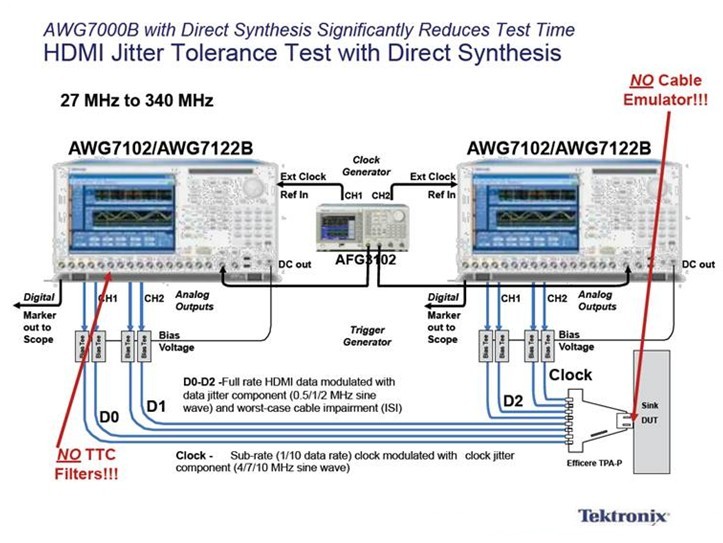 圖2:泰克獨一無二的AWG7000B直接合成方案可替換和省去所有類型的線纜仿真器和多達(dá)40個TTC濾波器,大幅降低HDMI接收端抖動容限測試的復(fù)雜度,并有效降低成本。
