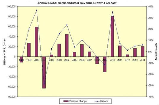 當2010年的增長與2000年相比時,要清楚此波周期的性質(zhì)與2000年時有明顯的不同,這是十分重要的。2000年的增長是由于1999年的產(chǎn)能迅速擴充以及不能持久的網(wǎng)絡(luò)泡沫增長來推動,所以2001年泡沫破裂,導(dǎo)致半導(dǎo)體業(yè)下降28.6%。相比2010年的增長是由于受2009年的外力突然打擊,產(chǎn)業(yè)自身增長的動力暫時被壓抑,因而在2010年半導(dǎo)體產(chǎn)業(yè)能迅速回復(fù),包括在2011年能繼續(xù)增長。