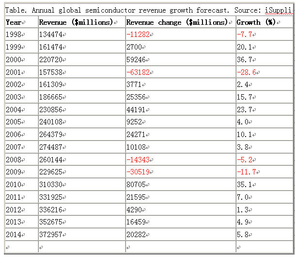 下圖是1998 to 2014年半導(dǎo)體銷售額及增長率預(yù)測;