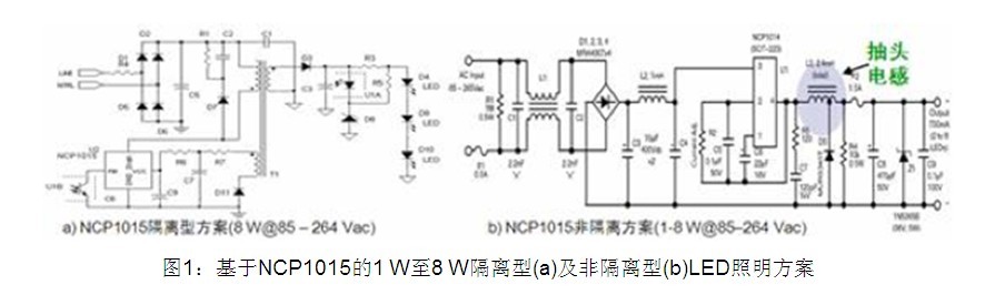 1W至8W的低功率LED通用照明應(yīng)用包括G13、GU10、PAR16、PAR20和嵌燈等。這類應(yīng)用的輸入電壓范圍在交流90至264 V之間,恒流輸出電流包括350 mA和700 mA兩種,能效要求為80%,還要求提供短路和過壓保護(hù)等特性。這類應(yīng)用可以采用安森美半導(dǎo)體的NCP1015自供電單片開關(guān)控制IC。該器件集成了固定頻率(65/100/130 kHz)電流模式控制器和700 V的高壓MOSFET,具備構(gòu)建強(qiáng)固的低成本電源所需的全部特性,如軟啟動(dòng)、頻率抖動(dòng)、短路保護(hù)、跳周期、最大峰值電流設(shè)定及動(dòng)態(tài)自供電功能(無需輔助繞組)等。NCP1015既可用于隔離型方案,也可用于非隔離型方案,見圖1。