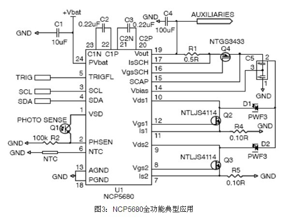 要在弱光下拍得高分辨率照片的數(shù)碼相機(jī)需要高亮度閃光。雖然白光LED能提供這個(gè)等級(jí)的光能,但需要比電池所提供的高出近400%的能量。以安森美半導(dǎo)體的NCP5680為例,它配合電池管理及超級(jí)電容來驅(qū)動(dòng)LED閃光至充分亮度,提供達(dá)10 A的大峰值電流。NCP5680的集成驅(qū)動(dòng)器還可管理超級(jí)電容,處理其他峰值功率功能,如變焦、自動(dòng)對(duì)焦、音頻、視頻、無線傳輸、GPS數(shù)據(jù)讀取及射頻(RF)放大,延長(zhǎng)電池使用時(shí)間又兼顧纖薄型設(shè)計(jì),節(jié)省開發(fā)時(shí)間、電路板空間及元器件成本,見圖3。