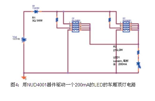 NUD4001提供了一種滿足汽車應(yīng)用的低成本解決方案。與采用線性或開關(guān)穩(wěn)壓器相比,它的設(shè)計(jì)更簡(jiǎn)便,可以構(gòu)成更簡(jiǎn)單而且成本更低的電路,見圖4。