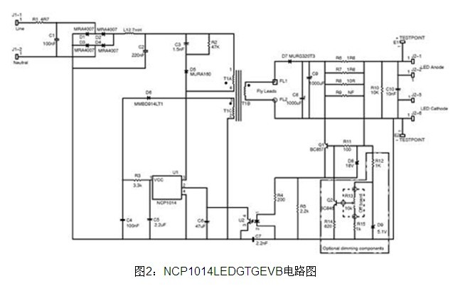 安森美半導(dǎo)體的NCP1014LEDGTGEVB評(píng)估板可驅(qū)動(dòng)1至8顆大功率高亮度LED。該設(shè)計(jì)基于集成了帶內(nèi)部限流功能的高壓電源開關(guān)的緊湊型固定頻率脈寬調(diào)制(PWM)轉(zhuǎn)換器NCP1014構(gòu)建。由于NCP1014采用固定頻率工作,電流不能上升到高于某個(gè)特定點(diǎn);導(dǎo)通時(shí)間的限制使輸入電流將跟隨輸入電壓的波形,從而提供更高的功率因數(shù)。評(píng)估板電路圖見圖2。