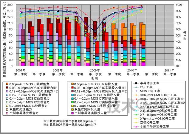 日前,國際半導(dǎo)體產(chǎn)能統(tǒng)計(jì)(SICAS)2010年第二季度(4~6月)的半導(dǎo)體產(chǎn)能公布。雖然部分半導(dǎo)體廠商已經(jīng)開始了增產(chǎn)投資,但因老生產(chǎn)線廢棄,晶圓處理能力未能大幅提高。在這種情況下,由于晶圓投入量增加,半導(dǎo)體的整體開工率達(dá)到了可以說是滿負(fù)荷的95%以上。一部分甚至超過了98%,呈 “超滿負(fù)荷運(yùn)轉(zhuǎn)”狀態(tài)。