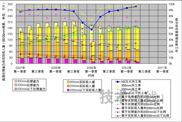晶圓的實(shí)際投入量方面,除部分特例外,均持續(xù)了YoY增20~30%、QoQ增近10%的增長率。其中,從半導(dǎo)體廠商的企業(yè)形態(tài)來看,硅代工廠商的增長率比較顯著,而從工藝技術(shù)來看,60nm以下工藝的增長率較為顯著。硅代工廠商的投入量為YoY增67.8%,QoQ增10.6%,達(dá)到40萬2200 片/周(以200mm晶圓換算,下同)。60nm以下工藝晶圓的投入量為QoQ增13.0%,達(dá)到78萬500片/周。