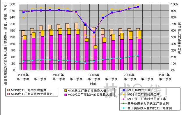 綜上所述,半導(dǎo)體整體的量產(chǎn)線開工率為YoY增18.6個百分點(diǎn),QoQ增2.1個百分點(diǎn),達(dá)到95.6%,MOS IC整體為YoY增17.1個百分點(diǎn),QoQ增長2.5個百分點(diǎn),達(dá)到95.7%,均超過了95%。尤其是需求量較大的80nm以下工藝、300mm晶圓以及硅代工廠商的開工率更是達(dá)到了超過98%的“超滿負(fù)荷運(yùn)轉(zhuǎn)”狀態(tài)。
