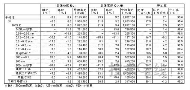 晶圓處理能力方面,半導(dǎo)體整體為同比(YoY)減少0.2%,環(huán)比(QoQ)增長0.6%,MOS IC整體為同比增長0.1%,環(huán)比增長0.6%,繼續(xù)持平。旨在從0.12~0.06μm生產(chǎn)線向0.06μm以下生產(chǎn)線過渡的細(xì)微化投資十分活躍,但是為擴(kuò)大晶圓處理能力的增產(chǎn)投資卻稍顯遜色:其沖抵了老生產(chǎn)線廢棄導(dǎo)致的晶圓處理能力下降。增產(chǎn)投資的實(shí)施,從半導(dǎo)體廠商的企業(yè)形態(tài)看,主要是硅代工廠商,從晶圓直徑來看,主要面向300mm晶圓進(jìn)行。而在硅代工廠商之外的垂直整合型半導(dǎo)體廠商(IDM)因進(jìn)行重組,廢棄了200mm以下的量產(chǎn)線。