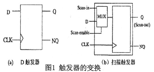 假設(shè)電路中的時(shí)序元件是由圖1(a)所示的D觸發(fā)器組成,寄存器變化法就是將此D觸發(fā)器轉(zhuǎn)化成圖1(b)所示的具有掃描功能的觸發(fā)器。從圖中可以看出掃描觸發(fā)器主要是在原觸發(fā)器的D輸入端增加了一個(gè)多路選擇器,通過掃描控制信號(hào)(Scan—enable)來選擇觸發(fā)器的輸入數(shù)據(jù)是正常工作時(shí)的輸入信號(hào)(D)還是測試掃描數(shù)據(jù)(Scan—in)。