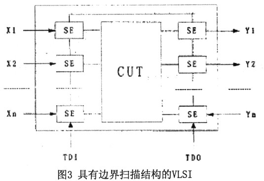 邊界掃描的基本思想是在靠近待測器件的每一個(gè)輸入/輸出管腳處增加一個(gè)邊緣掃描單元,并把這些單元連接成掃描鏈,運(yùn)用掃描測試原理觀察并控制待測器件邊界的信號(hào)。在圖3中,與輸入節(jié)點(diǎn)X1,X2…、Xm和輸出節(jié)點(diǎn)Y1,Y2…、Ym連接的SE即為邊界掃描單元,它們構(gòu)成一條掃描鏈(稱為邊界掃描寄存器一BSR),其輸入為TDI(TestDataInput),輸出TD0(TestData0ut)。在測試時(shí)由BSR串行地存儲(chǔ)和讀出測試數(shù)據(jù)。此外,還需要兩個(gè)測試控制信號(hào):測試方式選擇(TestModeSelect—TMS)和測試時(shí)鐘(TestC1ock—TCK)來控制測試方式的選擇。