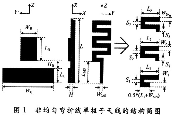 非均勻彎折線的單極子天線結(jié)構(gòu)如圖1所示?;暹x用Rogers4350B基板,厚度為0.762mm,相對介電常數(shù)為3.48。為了分析方便,將輻射元分成了3段;天線的饋電采用了50Ω的微帶線。