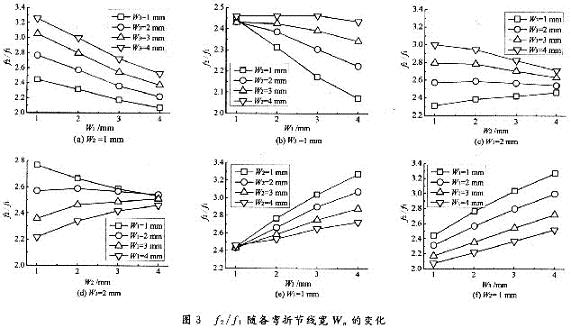 依次改變各彎折節(jié)的線長Ln(n=1,2,3)和線寬Wn(n=1,2,3),計算出天線的第一諧振頻率f1和第二諧振頻率f2。通過比較f2/f1的變化來研究各彎折節(jié)幾何參數(shù)對天線諧振特性的調(diào)節(jié)作用。