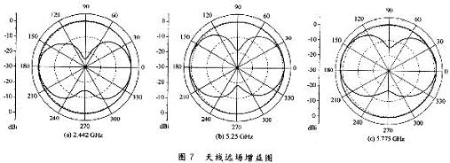 圖6示出了非均勻彎折線單極子天線的回波損耗曲線。從圖中可以看出,仿真結(jié)果與實際測試結(jié)果比較吻合。低頻段測得的阻抗帶寬(S1-1<-10dB)約為O.5GHz(2.2~2.7GHz);高頻段實際測得的阻抗帶寬(S11<-10dB)約為1.8GHz(4.48~6.28GHz)。圖7(a)~(c)分別示出了非均勻彎折線單極子天線在2.442GHz,5.25GHz和5.775GHz時的增益圖,增益分別為0.7dBi,1.65dBi和2.3dBi。