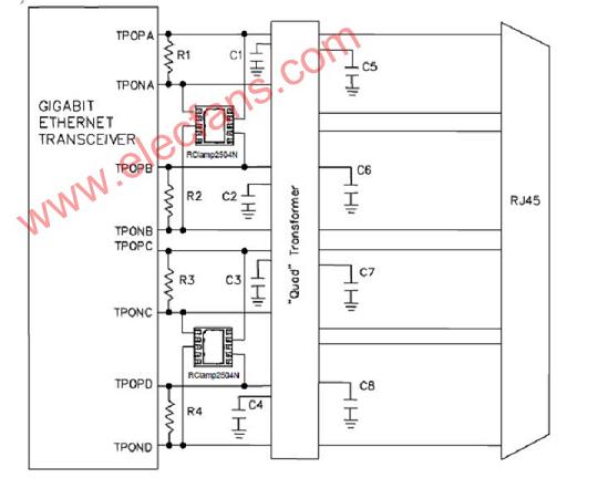 Semtech公司的RClamp2504N/3304N已被成功地應用在電腦的RJ45連接器里,它具有較低的鉗位電壓,電容和工作電壓,這樣可以保護一些敏感的物理層的芯片。該解決方案將非常好,成本低,加上好的RJ45連接器結構和PCB設計給線對地保護。