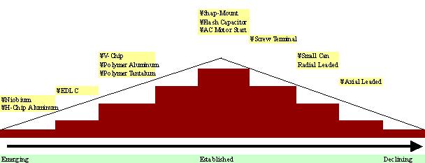 鋁電容器技術路線圖已經發(fā)展到一個節(jié)點上,在此新投資聚集在鋁固體聚合物元件,以及作為替代技術的碳和鈮介質開發(fā)上。更完善的產品,如單元安裝電容器(snap-mount)、閃光電容器(flash capacitor),和馬達啟動鋁電容器(motor start aluminum capacitors)已收到有限的投資,但繼續(xù)服務于更小的、增值的電容細分市場。老產品用于新技術研發(fā)所獲得的資金支持會更少,包括標準的徑向引線鋁電容器和軸向鋁電容器。例如,軸向引線鋁電容器,近些年來已經很少受到關注,但是他們現(xiàn)在作為一個傳統(tǒng)產品,在國防和汽車應用方面仍然保有市場。當用于上述圖表中列舉的所有主要產品的投資,在過去20年中獲得了不同程度的回報之時,市場已經轉向鋁固體聚合物電容設計,行業(yè)中的主要供應商正在調整自己的定位以把握巨大的市場機會。而且,在一些不同用途的關鍵細分市場上,如醫(yī)療電子,石油和天然氣勘探等領域,引入導電聚合物鋁技術,也會帶來增值和在特定應用市場的機會。