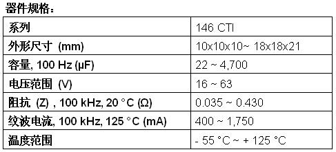 新款146 CTI電容器具有最苛刻的回流焊曲線,提供從10mmx10mmx10mm至更大的18mmx18mmx21mm的8種外形尺寸。今天發(fā)布的器件的高溫性能達+125℃,在100kHz和+20℃條件下的阻抗為0.035Ω~0.430Ω,在100kHz和+125℃條件下的紋波電流為400mA~1750mA,在+125℃下的使用壽命長達6000小時。