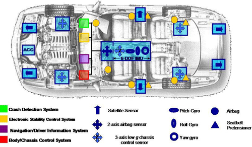 在汽車(chē)的主動(dòng)與被動(dòng)安全保護(hù)領(lǐng)域,市場(chǎng)趨勢(shì)主要包括以下幾個(gè)方面:首先,傳感器趨于整合,例如將ESP與安全氣囊放置在同一ECU之內(nèi);其次,傳感器的界面將趨于標(biāo)準(zhǔn)化,其中包括數(shù)字界面,SPI、DSI以及PSI5。目前,市場(chǎng)上PSI5的采用率要高于DSI;第三,市場(chǎng)上對(duì)高性能陀螺儀的需求將逐漸增多,尤其是配有高級(jí)駕駛輔助系統(tǒng)如ACC的汽車(chē);第四,中國(guó)和印度等國(guó)家已經(jīng)在司法層面上做出規(guī)定,要求所有汽車(chē)100%裝有安全氣囊; 第五、歐洲國(guó)家也頒布了有關(guān)行人保護(hù)的法規(guī),車(chē)載衛(wèi)星導(dǎo)航將成為主要趨勢(shì),因此正面撞擊傳感器將成為主要的解決方案。