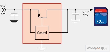 對于低速工作的小容量SD卡,耗電量常常小于100mA。假設(shè)鋰離子電池的額定工作電壓為3.7V,且存儲器的電源軌相當(dāng)高,則線性調(diào)節(jié)器就成為SD存儲器的電源選擇。不過,選定的線性調(diào)節(jié)器必須能以低壓降(LDO)方式工作,因為鋰離子電池的有效電壓范圍在3.2至4.2V之間。