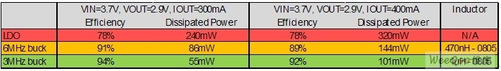 表1:LDO與6MHz降壓轉(zhuǎn)換器和3MHz降壓轉(zhuǎn)換器的電源效率與功耗對比。