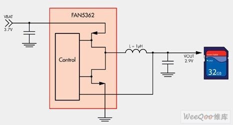 圖4:FAN5362降壓轉(zhuǎn)換器實現(xiàn)2.9VSD卡的供電電路。