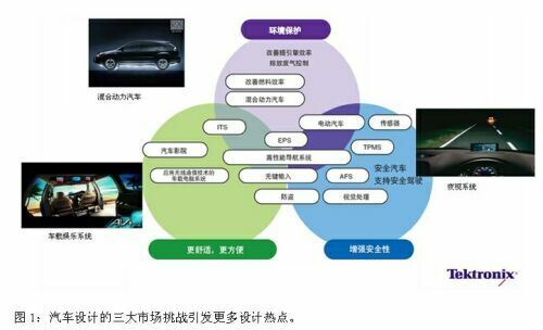 然而,面對日益復(fù)雜的汽車設(shè)計需求,特別是要推出中高端和商用的新能源汽車之時,自主創(chuàng)新和開發(fā)之路并非坦途。泰克科技的專家曾在不久前舉辦的一場汽車電子技術(shù)論壇上以擁有“100多個ECU、軟件代碼已經(jīng)達(dá)到700萬行”的豐田L(fēng)exus460汽車為例,強(qiáng)調(diào)了電子部件在汽車特別是高端汽車中所占據(jù)的比例越來越高。“如圖1,汽車電子關(guān)乎目前汽車設(shè)計的三大市場挑戰(zhàn),即如何滿足生態(tài)(環(huán)境保護(hù))、更舒適方便和增強(qiáng)安全性的要求,而圍繞解決這些挑戰(zhàn)的系統(tǒng)和子系統(tǒng)正是目前汽車電子設(shè)計的熱點和難點。”他指出。“而局域網(wǎng)、動力系統(tǒng)、電子控制單元和數(shù)字RFID的應(yīng)用在改善汽車生態(tài)學(xué)、安全性和舒適性方面扮演了重要的角色。