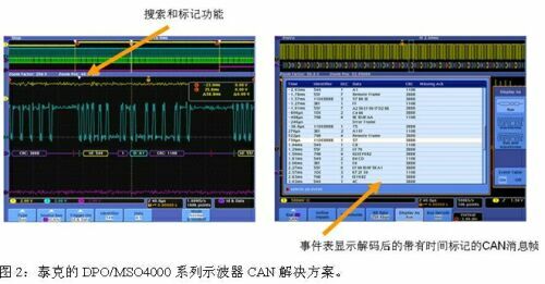 對于汽車中常用的CAN、LIN這類低速串行總線的調(diào)試,泰克的DPO/MSO4000系列示波器提供了簡單、易用、完整、高品質(zhì)的觸發(fā)、捕獲和解碼解決方案。如圖2,該示波器系列提供了搜索和標(biāo)記功能,可在事件表顯示解碼后的帶有時間標(biāo)記的CAN消息幀,這一功能是其他競爭性產(chǎn)品所不具備的。