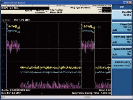 圖5圖中的信道功率測量僅顯示了前導(dǎo)碼的選通有了穩(wěn)定的觸發(fā),頻譜分析儀就可以啟動掃描測量;