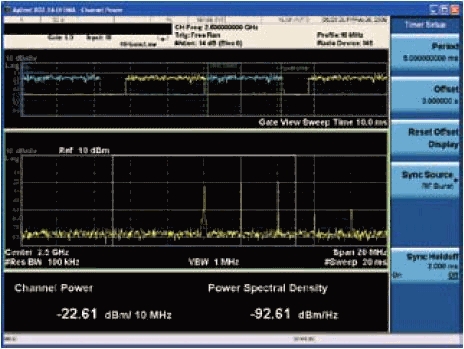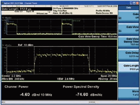 如果是測量TDD無線信號,那么還必須選通出精確的目標區(qū)域。例如,某些設(shè)計人員可能只對WiMAX信號的前導(dǎo)碼功率電平或某個特定區(qū)域感興趣。圖5顯示了WiMAX信號的選通前導(dǎo)碼測量。這種測量通常稱為WiMAX接收信號強度指標(RSSI)。在該圖中,前導(dǎo)碼的選通只會使選通參數(shù)發(fā)生變化,是保證精確測量所必需的。不同的分析儀平臺目前市場上已有幾種頻譜分析儀可對WiMAX信號進行信道功率測量。AgilentPSA和X系列分析儀平臺只是其中之一。
