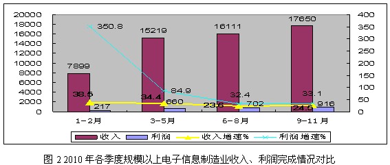 2、經(jīng)濟(jì)效益持續(xù)提高。2010年,規(guī)模以上電子信息制造業(yè)實現(xiàn)主營業(yè)務(wù)收入63645億元,同比增長24.1%;實現(xiàn)利潤2825億元,同比 增長57.7%。全行業(yè)銷售利潤率從一季度的2.7%提高到4.4%,高出上年(3.5%)近1個百分點。全行業(yè)虧損企業(yè)3940個,同比下降 19.1%;企業(yè)虧損面(18.8%)比上年同期(26.1%)減少7.3個百分點,虧損企業(yè)虧損額同比下降42.5%。