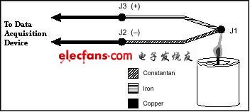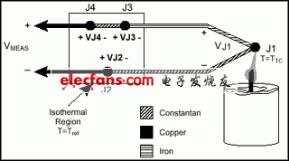 圖3中,J2和J4接點屬于同一類型(銅鎳合金);因為兩者處于等溫環(huán)境,J2和J4也是同樣的溫度。因為電路中電流方向緣故,J4端產(chǎn)生一個Seebeck正電壓,J2端產(chǎn)生一個Seebeck負(fù)電壓。因此,接點抵消了相互之間的影響,測量電壓的總量就為零。J1和J3接點都是鐵—銅鎳合金接點。但是他們的溫度可能不同,因為他們可能不是在等溫環(huán)境中。因為他們處于不同溫度環(huán)境下,J1和J3接點都可以產(chǎn)生Seebeck電壓,但是大小不同。為了補(bǔ)償冷端J3,測量其溫度并將其作用電壓從熱電偶測量中減去。