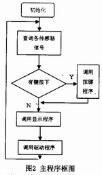 主程序的主要功能是循環(huán)調(diào)用顯示子程序、按鍵子程序,查詢各輸入信號狀態(tài),根據(jù)按鍵設(shè)定的各種參數(shù)和各輸入信號狀態(tài)控制各執(zhí)行機(jī)構(gòu),完成對PCB周轉(zhuǎn)箱托架系統(tǒng)的傳動控制,以及對PCB板的有序傳送,判別系統(tǒng)運(yùn)行狀態(tài)是否異常,并及時報警或解除報警。主程序框圖如圖2所示。