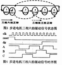 驅(qū)動子程序主要負(fù)責(zé)生成步進(jìn)電機(jī)驅(qū)動器所需要的信號。當(dāng)上行鍵或下行鍵按下,或者根據(jù)主程序運(yùn)行結(jié)果,需要提升或降落周轉(zhuǎn)箱托架,主程序會調(diào)用步進(jìn)電機(jī)驅(qū)動子程序。步進(jìn)電機(jī)采用三相六拍工作方式,根據(jù)絲杠付螺紋間距,計算出步進(jìn)電機(jī)每步進(jìn)程,再根據(jù)周轉(zhuǎn)箱板間距,確定不同工況下,步進(jìn)電機(jī)的正/反轉(zhuǎn)步數(shù),這些步數(shù)保存在各相應(yīng)存貯器里,供主程序調(diào)用驅(qū)動子程序時使用。圖3和圖4分別為步進(jìn)電機(jī)三相六拍工作方式時驅(qū)動信號的狀態(tài)圖和時序圖。
