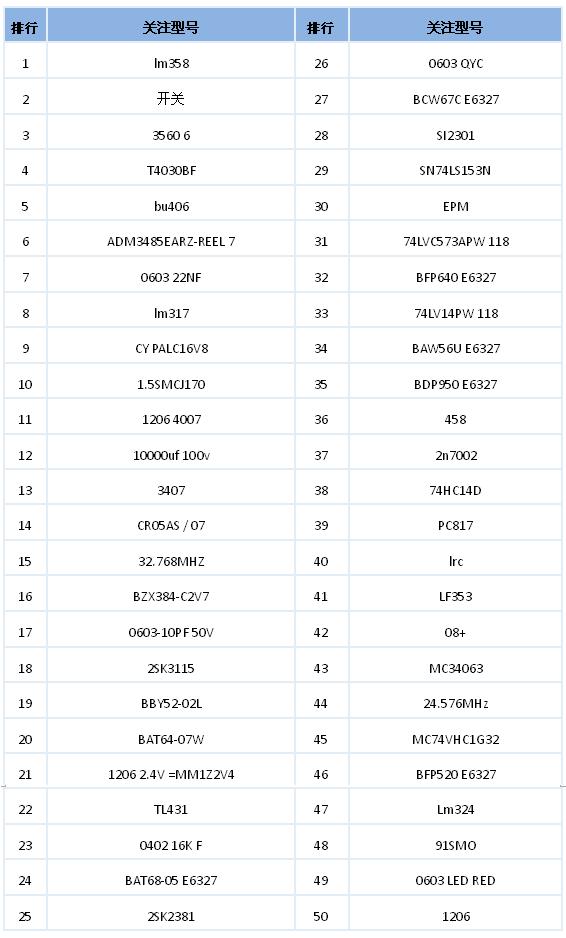 - 過去一周商家關(guān)注的IC型號(hào)排行榜top50一覽