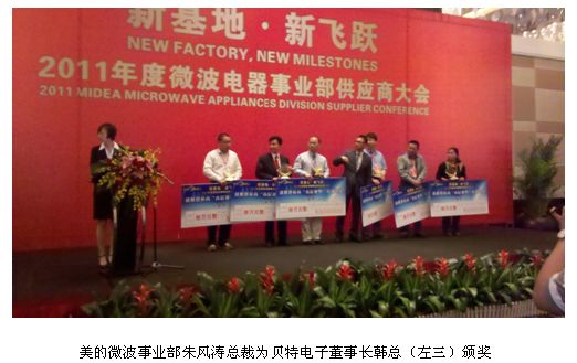 2011年4月14日(星期四),貝特電子科技有限公司應(yīng)邀出席廣東美的集團(tuán)舉行的2011年度微波電器事業(yè)供應(yīng)商大會(huì)和新基地落成典禮,在此次盛會(huì)中,來自海內(nèi)外的供應(yīng)商和客戶參加了此次為期兩天的盛會(huì),期間美的將從其900多家供應(yīng)商中選出20名最佳供應(yīng)商授予新年度“戰(zhàn)略供應(yīng)商”大獎(jiǎng)。新基地也進(jìn)一步印證了美的的”5年再造一個(gè)美的”的宏偉戰(zhàn)略,這對(duì)我們?nèi)w供應(yīng)商均是一個(gè)再上臺(tái)階的機(jī)會(huì)。