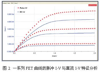 利用這種工具套件,研究人員可以同時(shí)進(jìn)行直流和脈沖IV測(cè)試以掌握器件特性,例如如圖2所示的FET器件系列特征曲線。