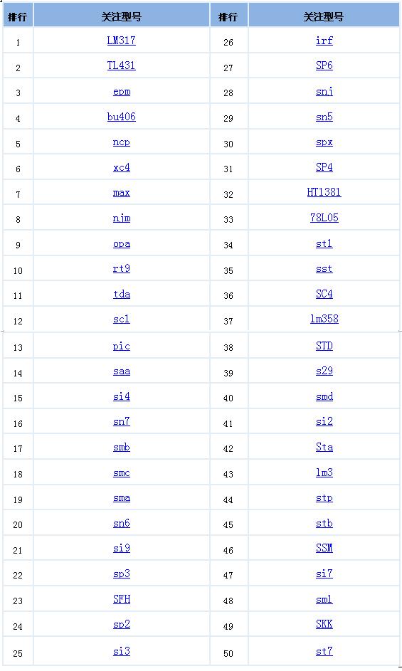 各位商戶你們有福啦!從這月起,《華強電子》的小編們會定期從市場搜集熱門型號和廣大采購者經(jīng)常詢價的產(chǎn)品型號的前五十名,以供大家參考,如果我們的跑堂能給廣大商家?guī)硪稽c生意上的幫助,再辛苦也值得。如果您有這方面的需求或者建議,歡迎來電咨詢。