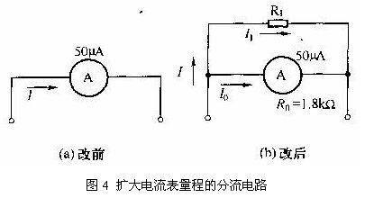 上述的分流電路計算結(jié)果表明,只要在50uA表頭上并聯(lián)一個200Ω的電阻,即可使表頭的量程由50uA擴大到500uA。