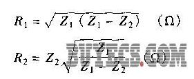 式中,Z1和Z2為網(wǎng)絡(luò)1和網(wǎng)絡(luò)2的阻抗,它們分別為300Ω和75Ω。將它們代入上面兩個公式中,則求得RI=259.8Ω,R2=86.6Ω。