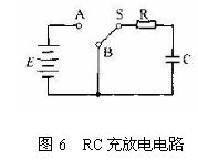 RC充放電電路如圖6所示。圖中開關(guān)S原來停留在B點位置,電容器C上沒有電荷,它兩端的電壓等于零。當(dāng)開關(guān)接到A點時.電源E通過R向電容器 C充電,在電路接通的瞬間,電容器電壓Vc=0,充電電流最大值等于Z/R。隨著電容器兩極上電荷的積累,Vc逐漸增大,電阻器R上的電壓Vr =E -Vc,充電電流i=(E—Vc)/R且隨著Vc的增大而越來越小,Vc的上升也越來越慢。當(dāng)Vc=E時,i=0,充電過程結(jié)束。