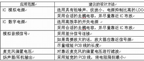 在便攜式音頻系統(tǒng)中,主電源通常是電池。由于系統(tǒng)其它部分(包括無線收發(fā)器、存儲器和顯示器等)造成的瞬態(tài)變化,使得電池的噪聲非常大。因此在給音頻編解碼器或DAC以及其它音頻信號路徑上的器件(如放大器等)提供模擬電源時,最好不要直接使用電池電壓,而是使用具有良好電源抑制比(PSRR)和低輸出噪聲的低壓降穩(wěn)壓器(LDO)。這樣可確保模擬電路有‘潔凈’的工作電源。需要仔細(xì)選擇LDO,確保其額定電流能足以滿足所供電電路的需求。在模擬電源端去耦電容的使用方法也很重要。大的去耦電容(10µF 以上)非常適合電源濾波。數(shù)值較小的去耦電容(1µF以下)在提供IC所需的快速瞬變電流時也是必需的。去耦電容必須盡可能靠近模擬電源引腳放置,并在電容和電源與地的連接中盡可能避免出現(xiàn)PCB過孔。相對于比較大的電容來說,較小的去耦電容要更靠近IC引腳擺放,因為串聯(lián)電阻對較小電容的響應(yīng)時間影響較為顯著。