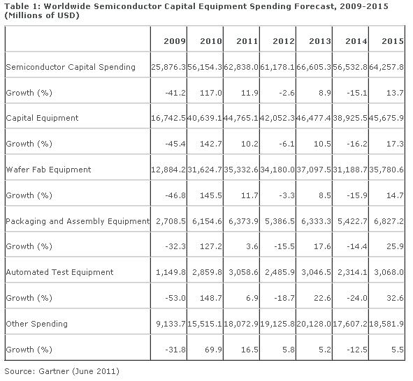 半導(dǎo)體資本設(shè)備市場的所有領(lǐng)域預(yù)計(jì)都將在2011年呈現(xiàn)增長態(tài)勢(見表一)。 Gartner分析師表示,2011年的支出是由積極的晶圓設(shè)備制造支出,處于領(lǐng)先的集成設(shè)備制造商(IDM)邏輯能力的加速生產(chǎn),以及內(nèi)存公司加速雙重曝光等因素推動的。2012年,半導(dǎo)體資本設(shè)備支出將下滑2.6%,隨后將在2013年增長8.9%。隨著內(nèi)存供過于求的影響,周期性的下跌應(yīng)該在 2013年底出現(xiàn)。