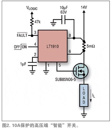 自從功率MOSFET器件推出以來,設(shè)計師們一直將它們視作繼電器的潛在替代產(chǎn)品?,F(xiàn)代N-MOSFET開關(guān)的導(dǎo)通電阻值在一位數(shù)毫歐姆范圍內(nèi),允許使用沒有笨拙散熱結(jié)構(gòu)的標(biāo)準(zhǔn)表面貼裝技術(shù)。目前已經(jīng)開發(fā)出了低價集成電路解決方案,這種方案可提供自含式升壓柵極驅(qū)動功能。這些電路還采用了快速故障保護機制,這樣MOSFET就永遠(yuǎn)不會有出現(xiàn)故障的風(fēng)險。凌力爾特公司的LT1910就是這樣的“智能開關(guān)”控制集成電路,該器件利用低阻值高壓端電流檢測電阻(類似圖1(c))檢測電路過載,并在發(fā)生損害之前關(guān)斷正在工作的MOSFET。該集成電路一檢測到過載情況,就設(shè)置一個警告標(biāo)記,并周期性地嘗試重新啟動該負(fù)載,直到故障清除為止。盡管這個集成電路本質(zhì)上只是二進制,但是就用電流檢測形成如圖2所示的堅固“閉環(huán)”電子繼電器解決方案而言,這是一個不錯的實例。