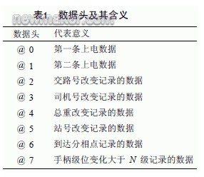 該裝置采用了大容量的存儲器。由于機車運行的數(shù)據(jù)較多,為了降低GPRS 的使用成本,對于所有采集的信息均采用非分區(qū)定長壓縮方法[2]存儲,每包數(shù)據(jù)定長35 個字節(jié),由數(shù)據(jù)頭、公共數(shù)據(jù)、數(shù)據(jù)幀標識、數(shù)據(jù)校驗位等4 部分組成。數(shù)據(jù)頭占一個字節(jié),公共數(shù)據(jù)占32 個字節(jié),數(shù)據(jù)幀標識和校驗結(jié)果各占一個字節(jié)。由于每包數(shù)據(jù)只有35 個字節(jié),不能包含所有的機車運行信息,因此在上電的時候?qū)⑼暾囊粭l機車運行信息拆分成兩包發(fā)送。另外,@7 代表的級位變化大小N 的值可以在程序中設(shè)定。數(shù)據(jù)頭及其具體含義如表1 所示。